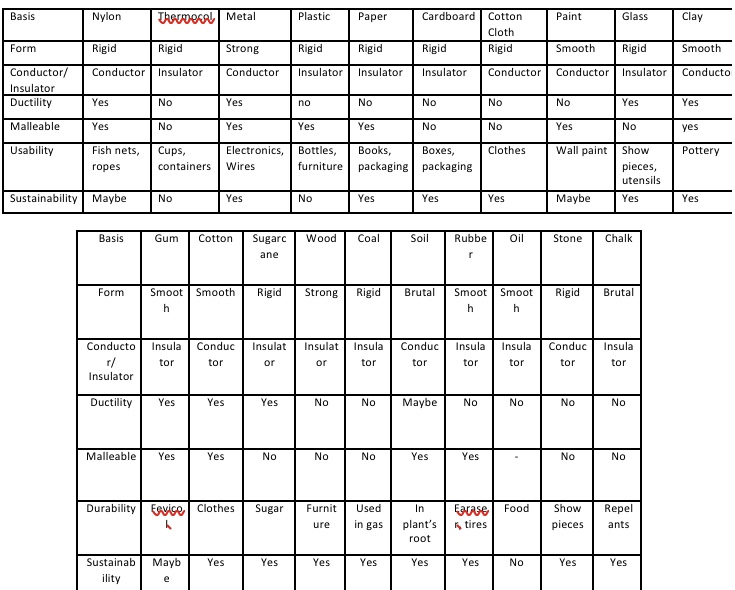 The assignment for the weem was to collect materials of each type and then make a table on their characteristics and nature.