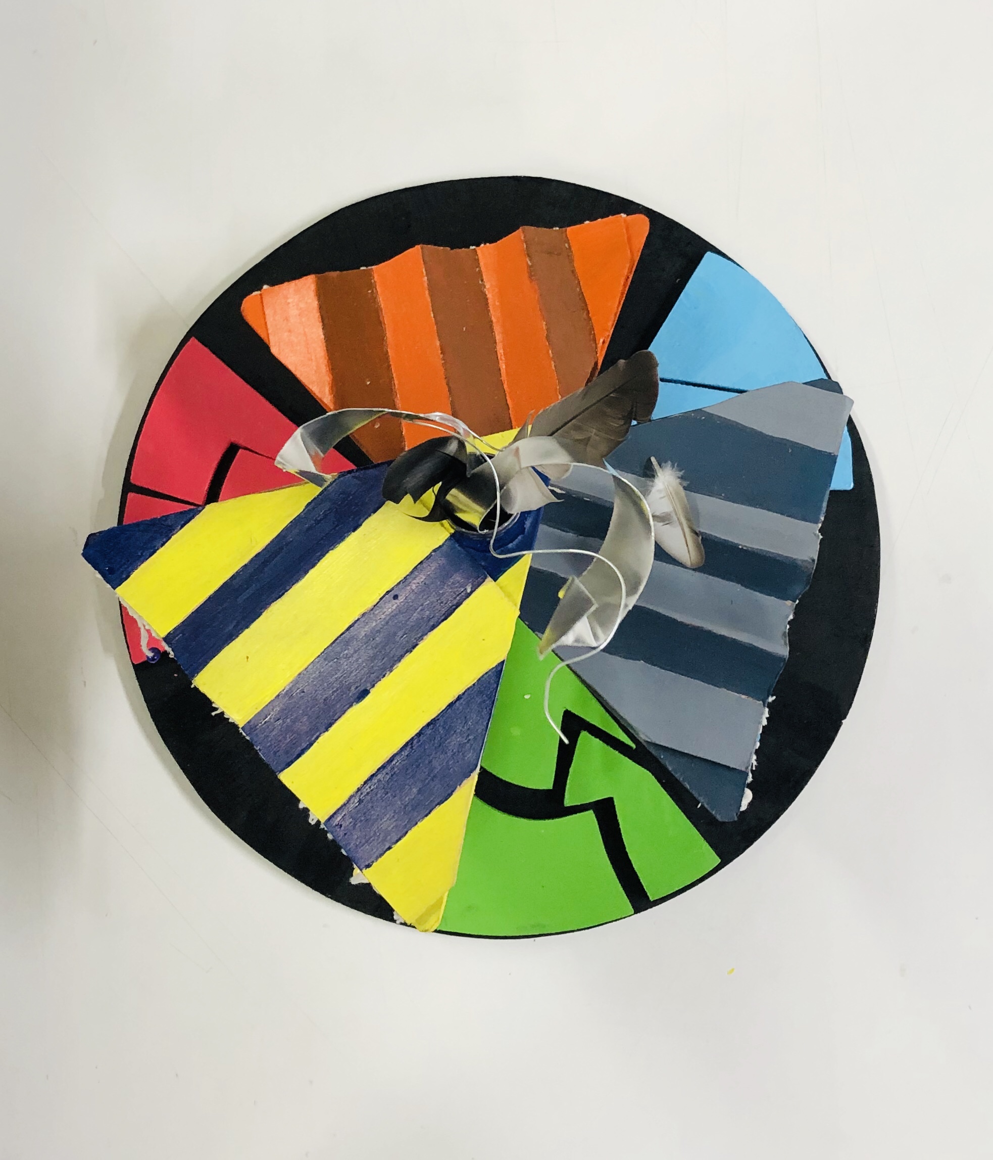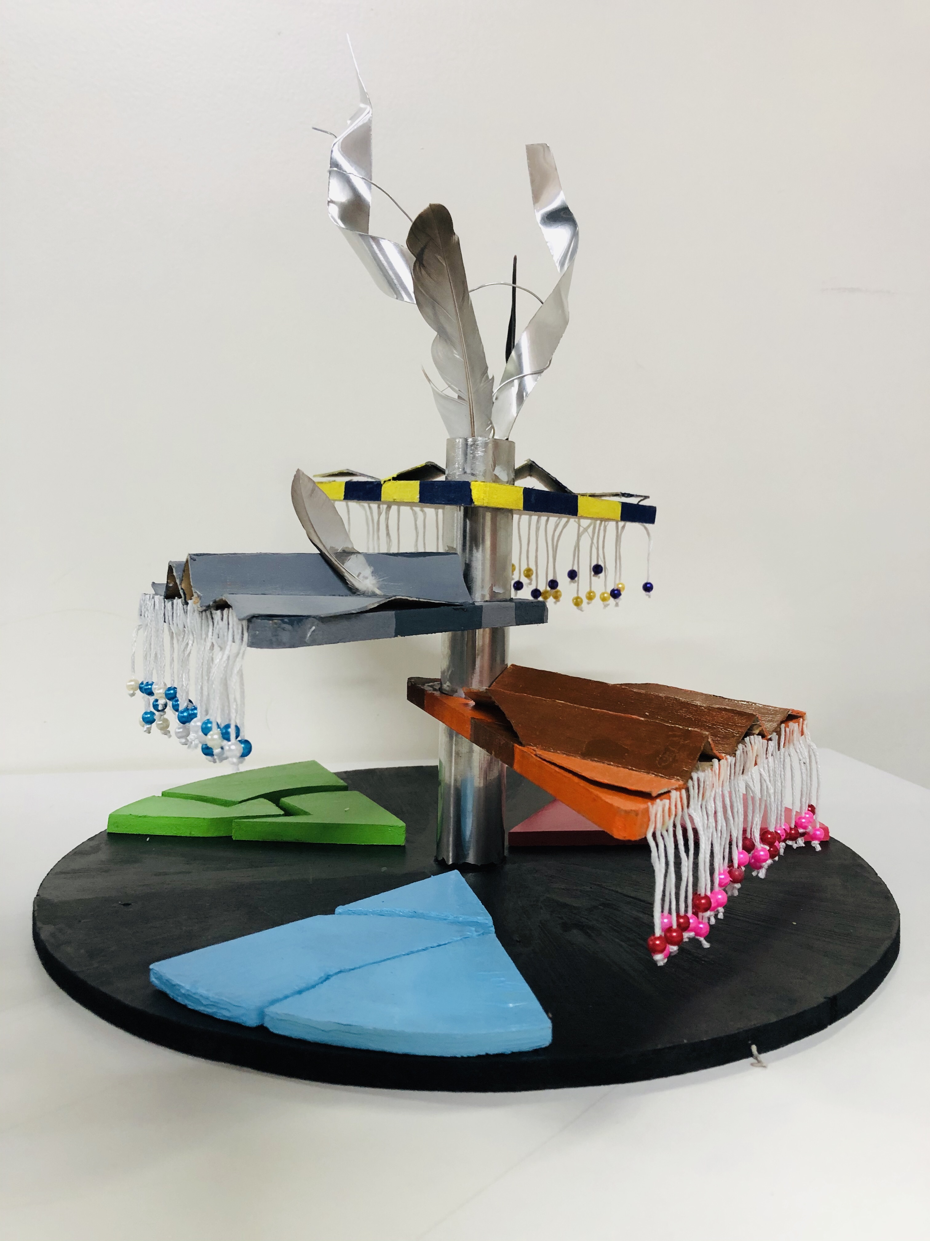 Next comes the colour pallet of the place. Dadar at first is dominated by the colours of pigeon but when you look around, dadar is a combination of mulitple colours which derives from different shops, markets of vegetables, textiles, flowers, different installations, people etc. The colours of the triangles in the rod are the colour combination of three different installations. While the balls hanging down represents all sorts of market. We’ve used the thread to hang them out as a vendor uses them to hang their flowers and how they hand it in the tunnels. The base of the model is black, to represnt how the people who work their absorb the heat of the sun while working hard to earn a living like the colour black absorbs heat and at the same time the blocks have been painted in vibrant colours to show how the hustle bustle and the fuss of the place is always in motion no matter how high the sun is.