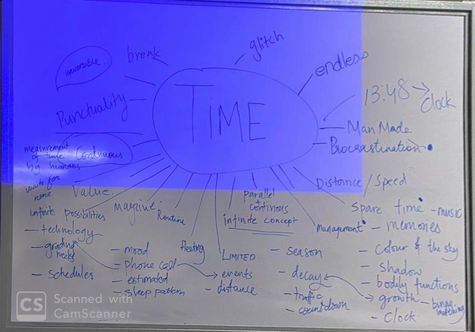 All of us were pulled of with the same question, what did time mean to us? We didn’t fell for the question for how easy seems to be answered. To sort all out we begin by writing on the board what time meant to us in a some words. For google time is the indefinite continued progress of existence and events in the past, present, and future regarded as a whole, as of to me, time is something that waits for none, just fleeting away without considering anything in the world. All of us came with several of different concepts, technicalities, perceptions, usage, etc and all of them lead to the diversified meaning of time.