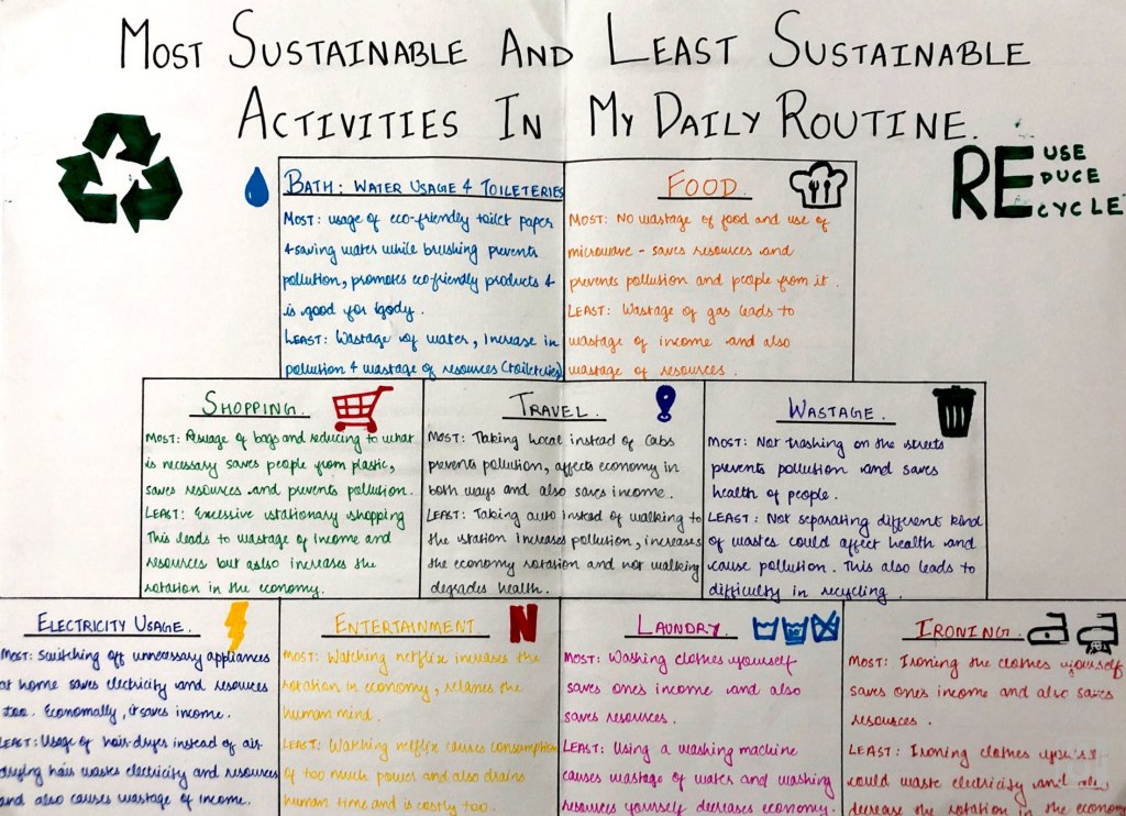 After this project, i have genuinely learned a lot and have actually started implementing different ways to make my daily activities more sustainable and better than yesterday. I have started sticking to the list of groceries instead of buying everything i like, i have started walking to the station instead of catching an auto, i have started to avoid ‘kurkure’ and rather have ‘ghar ka poha’ and trying to develop quite a few more activities to make my daily routine more sustainable.